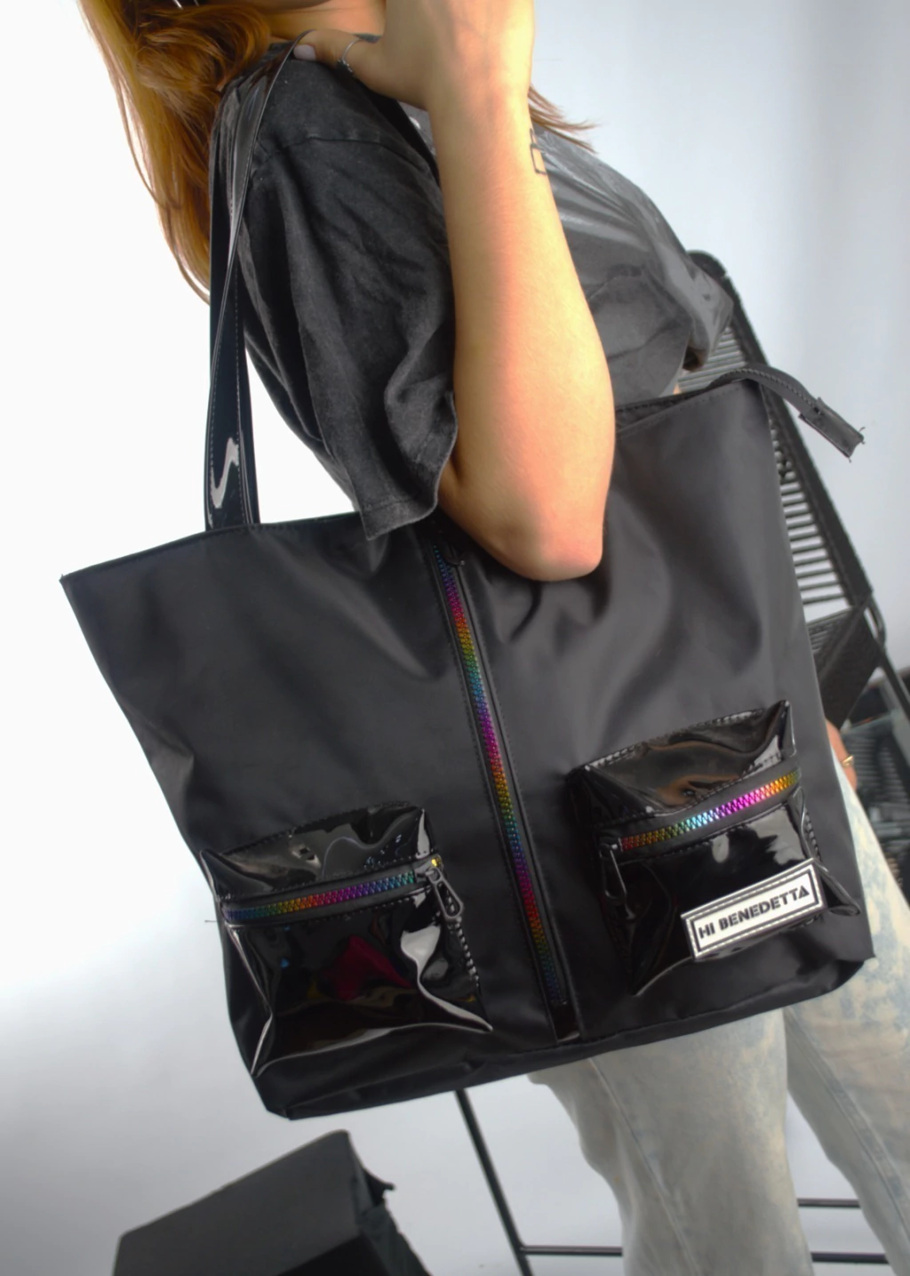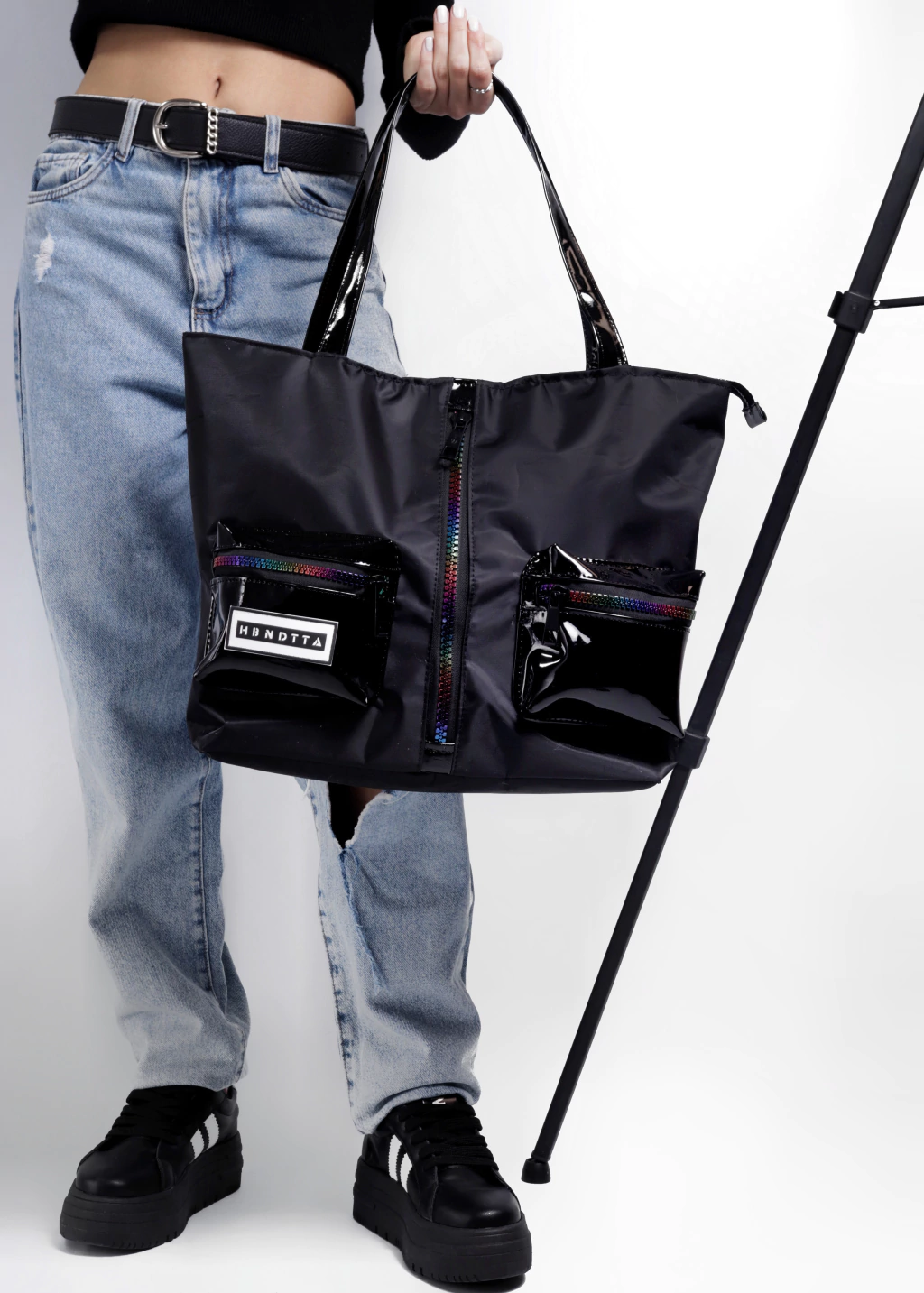 Con un acceso principal por cierre y un cierre frontal tornasolado que brilla más que tu sonrisa después de un café, ¡es imposible que no te enamores! Además, cuenta con dos bolsillos frontales charolados, perfectos para esconder ese chicle que no querías que nadie viera.