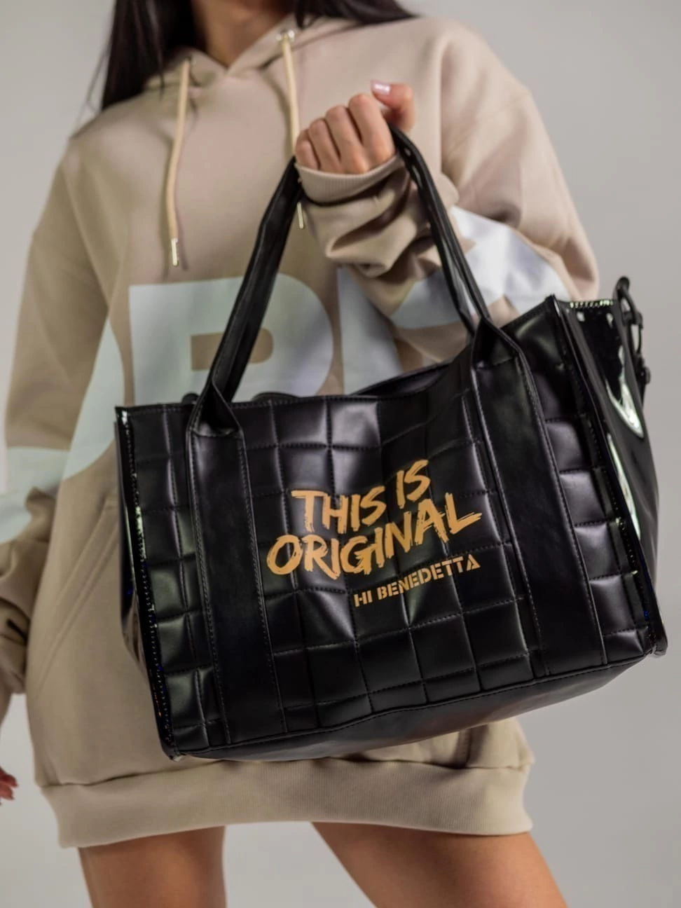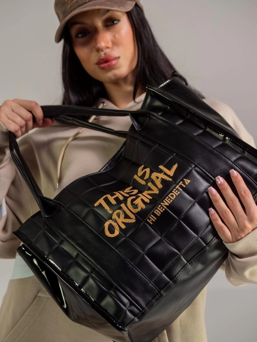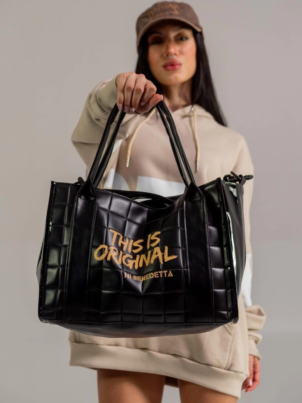Su diseño distintivo, con franjas de PU y un lateral de charol, la convierte en una opción moderna y única. El acceso se realiza de manera práctica y segura mediante un broche magnético, asegurando que tus objetos estén siempre al alcance.