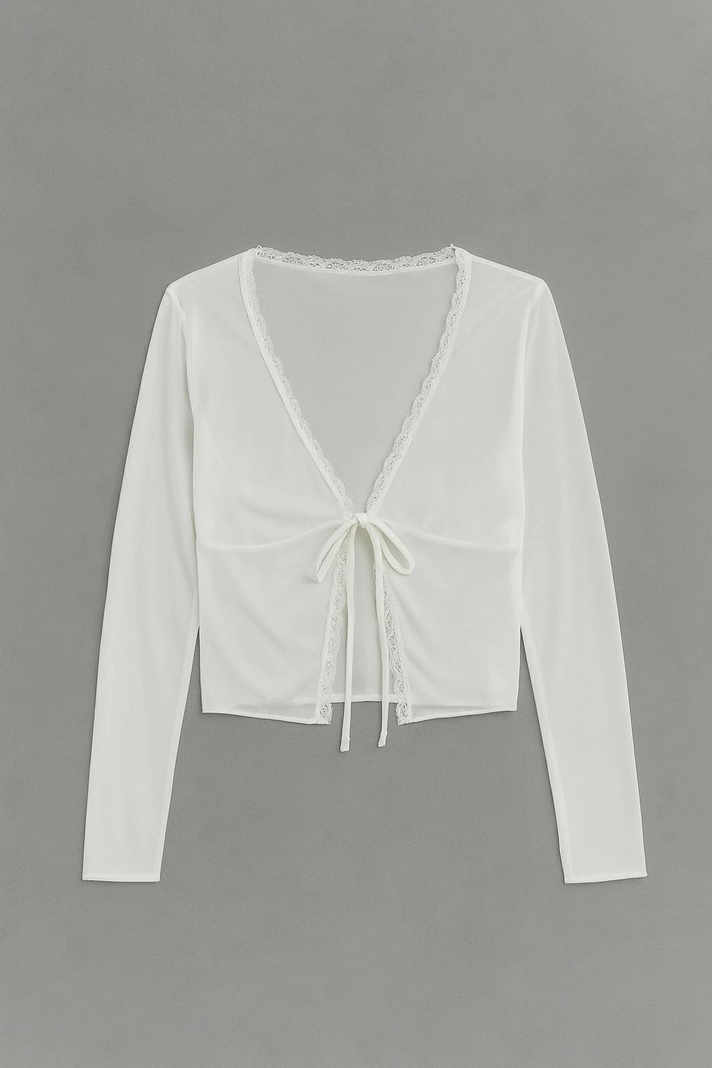 Confeccionada en tul de alta calidad, esta camiseta ofrece una textura ligera y transparente que aporta un aire etéreo y femenino. El detalle del cordón delantero no solo agrega un toque distintivo y moderno, sino que también permite un ajuste personalizado para mayor comodidad y estilo.